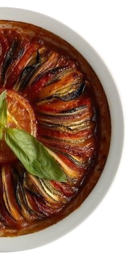 Traditional ratatouille is a Provencal stew of eggplant, zucchini, peppers, onion, and tomatoes, slow-cooked in olive oil with garlic and herbs (thyme, basil).
